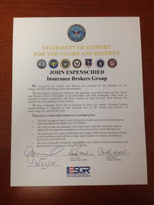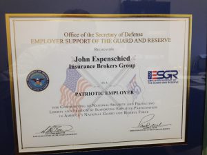 Office of the Secretary of Defense ESGR Employer Support of The Guard and Reserve Recognizes John Espenschied and Insurance Brokers Group as a Patriotic Employer for contributing to national security and protecting liberty and freedom by supporting employee participation in America’s National Guard and Reserve Force.